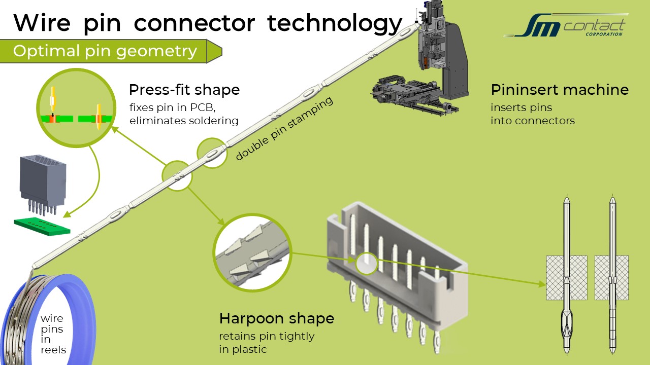 SM Contact continuous wire pin connector technology is processed with stand-alone or inline Pininsert machines. Pininsert installs pins into the plastic connector or PCB. Pins are manufactured based on plated round or square wire and fed automatically from reels with up to 200 000 pins in end-to-end format.